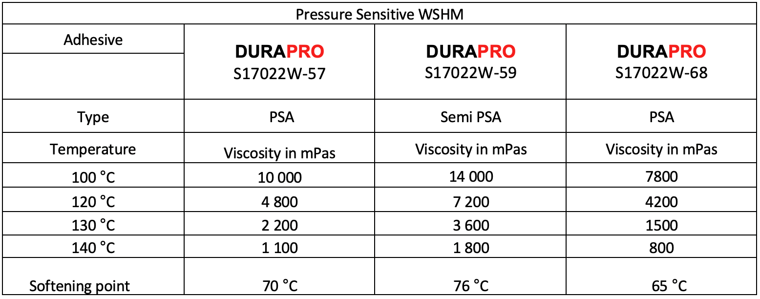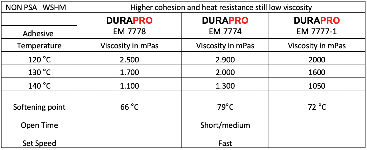 DURAPRO water-soluble hot melt adhesives range provides several laminating adhesive for tissue, paper and board applications. WSHM can be formulated as pressure sensitive or non pressure sensitive product solutions but still be water-soluble to meet customer needs. DURAPRO WSHM successfully passed TAPPI UM 213:2012 as splicing adhesives meeting all repulpability requirements.